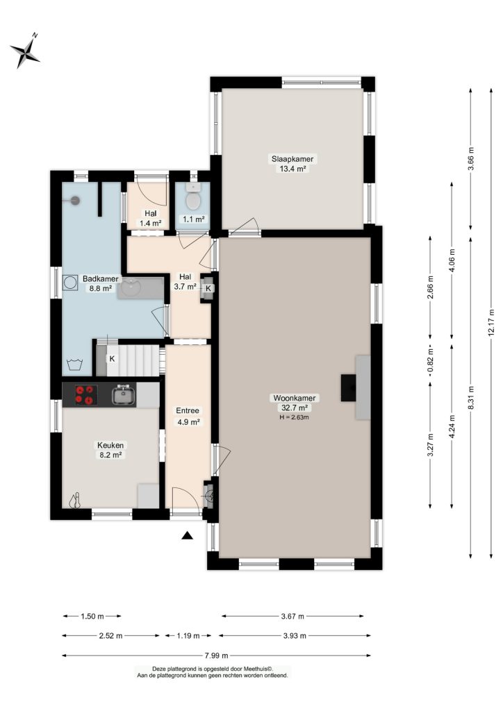 Entree 5 m2 met de trapopgang en meterkast; hal totaal 5 m2 met toegang tot het toilet, een kelderkast en de badkamer 9 m2 voorzien van een douche, wastafelmeubel en de plaats van de wasmachine; woonkeuken 8 m2 met enige inbouwapparatuur, dubbelglas en de plaats van de CV-ketel; royale woonkamer 33 m2 met dubbelglas en en een laminaatvloer; via de woonkamer en een afstapje te bereiken slaapkamer 13 m2 met dubbelglas en een schuifpui naar buiten.