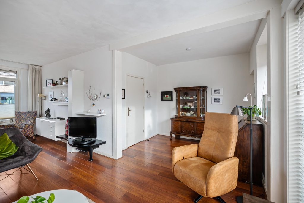 Hal/entree met een laminaatvloer, trapopgang, garderobenis en een gemoderniseerd toilet; L-vormige woonkamer 34 m2 met een laminaatvloer, deels kunststof kozijnen voorzien van HR++ beglazing en een schuifpui naar de tuin; via de woonkamer te bereiken keuken van ruim 11 m2 met enige inbouwapparatuur en een deur naar de tuin.