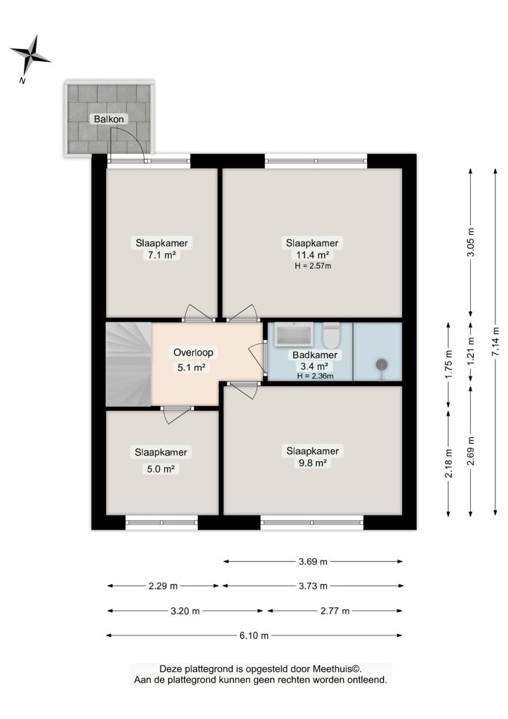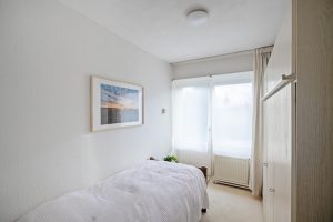 Overloop met trapopgang en de toegang tot zowel een gemoderniseerde badkamer 3,5 m2 voorzien van een douche, wastafelmeubel en toilet alsmede 4 slaapkamers, resp.: 11 m2, 10 m2, 7 m2 met een deur naar het balkon en 5 m2 (alle slaapkamers zijn voorzien van kunststof kozijnen en HR++ beglazing).
