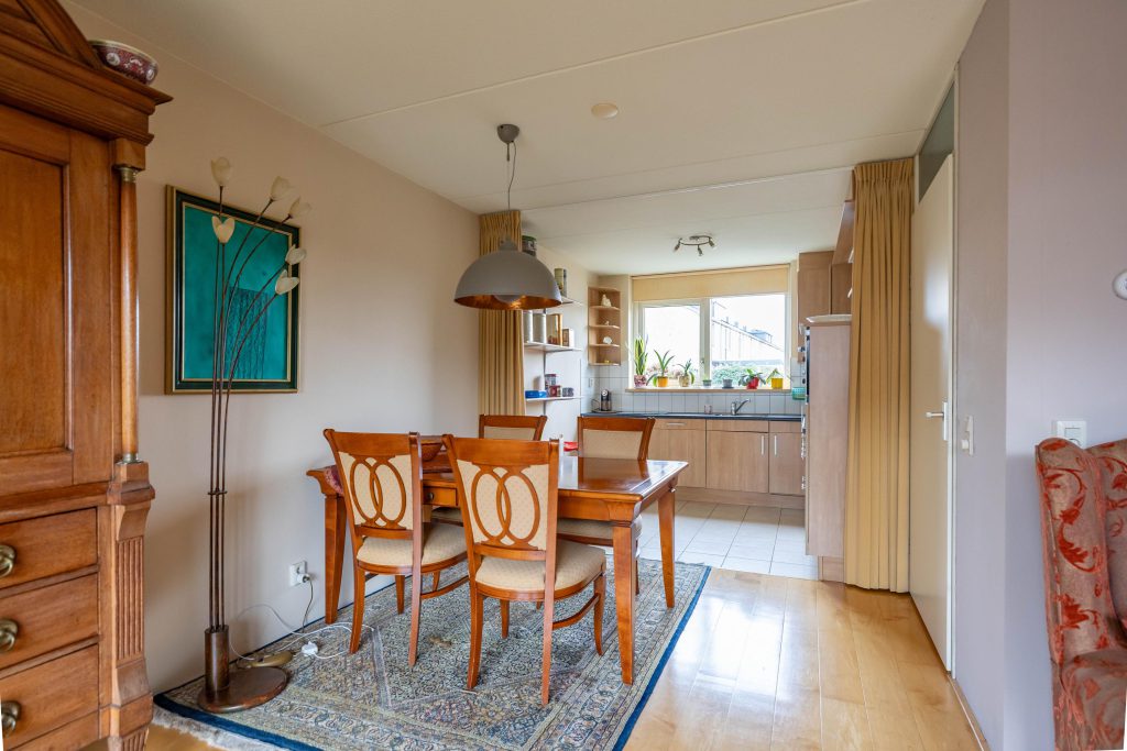 Hal/entree 7 m2 met de trapopgang en het toilet; L-vormige en tuingerichte woonkamer 33 m2 met een lamelparketvloer, convector, deur naar de tuin en een open keuken voorzien van inbouwapparatuur.